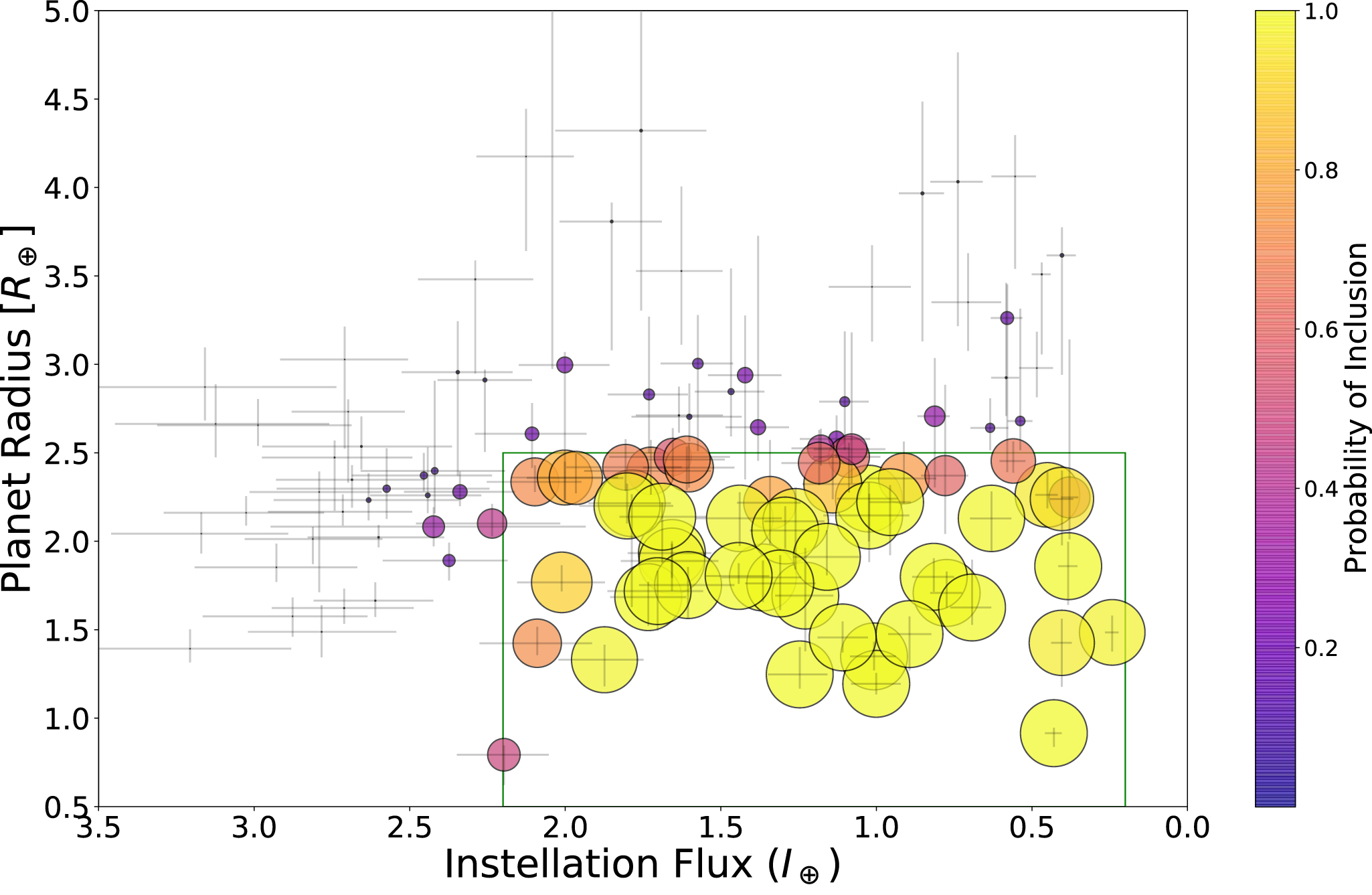 By restricting our analysis to planets with r ≤ 2.5 R⊕ in regions of instellation flux close to the HZ, we believe we are avoiding the biases pointed out by Lopez & Rice (2018) and Pascucci et al. (2019). As seen in Figure 1, there are more detected planets with 1.5 R⊕ ≤ r ≤ 2.5 R⊕ than planets with 0.5 R⊕ ≤ r ≤ 1.5 R⊕, so our results in Section 4 will be driven by these larger planets, but all planets we consider are at similar low levels of instellation. In Figure 2 of Lopez & Rice (2018) we note that for instellation flux between 10 and 20 there is little change in the predicted relative sizes of the 1.5 R⊕ ≤ r ≤ 2.5 R⊕ and 0.5 R⊕ ≤ r ≤ 1.5 R⊕ planet populations. Naively extrapolating this to instellation of <2 in the HZ, we infer that the sizes of these larger- and smaller-planet populations in the HZ are similar. Therefore by working at low instellation flux we are likely less vulnerable to overestimating the HZ rocky planet population.