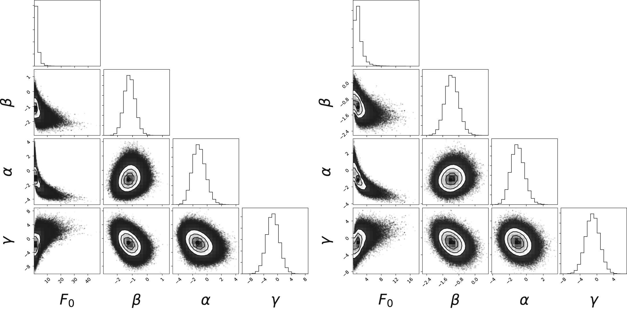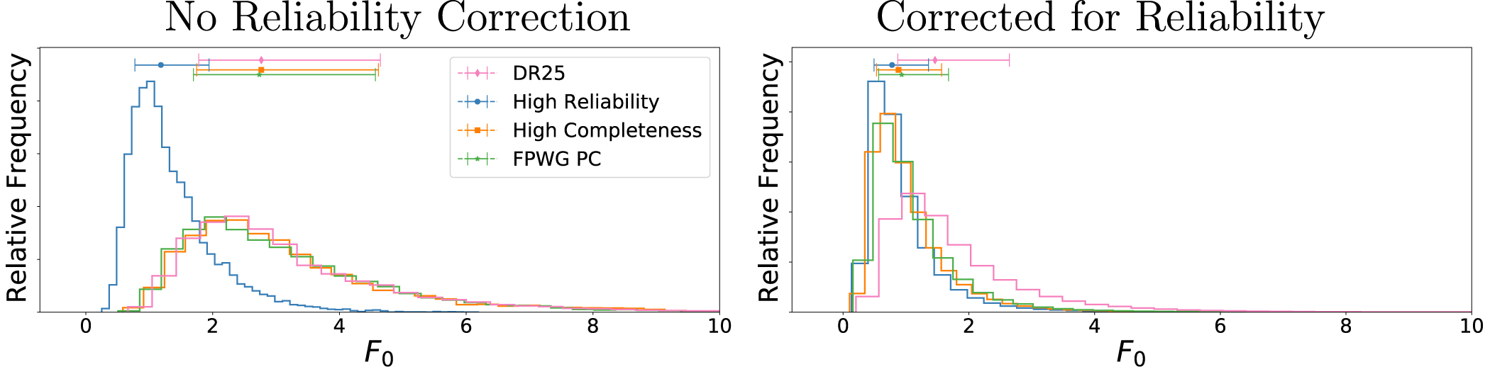 Figure 17. Distributions of the parameter F0 in model 1 (see Equation (5)), the occurrence for the hab2 stellar population, for 0.5 R⊕ ≤ r ≤ 2.5 R⊕ and instellation flux range 0.2 I⊕ ≤ I⊕ ≤ 2.2 I⊕ for the high-reliability (blue), DR25 (pink), FPWG planet candidate (green), and high-completeness (orange) vetting, computed with the Poisson method. Left: Without correcting for reliability. Right: Corrected for reliability.
