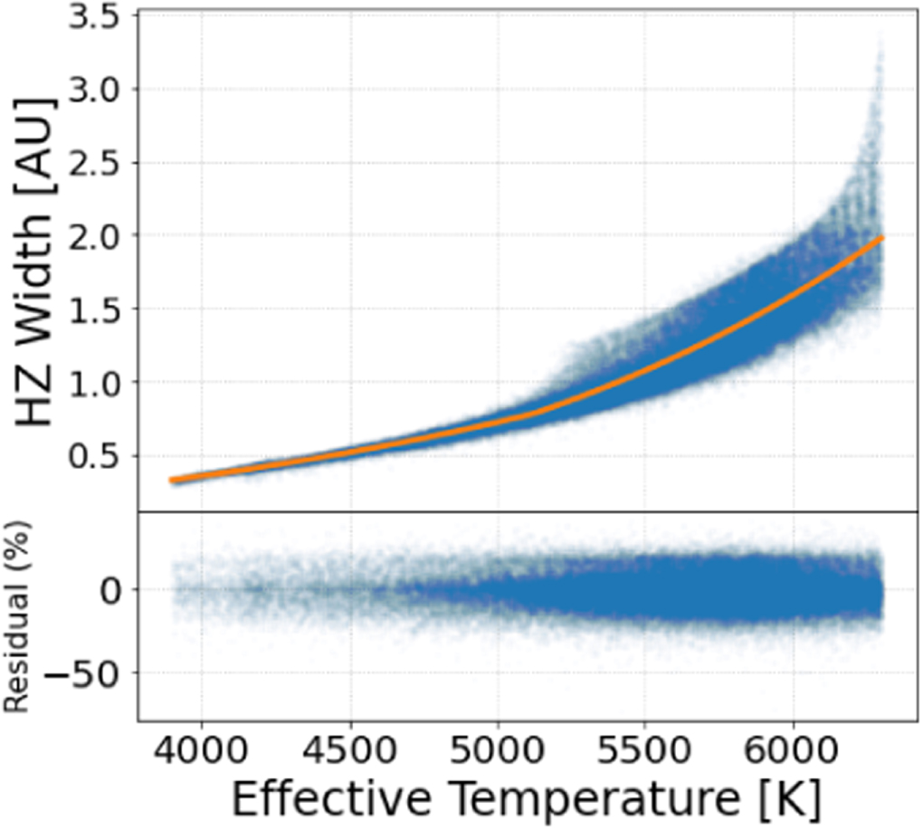 Figure 3. The width of the optimistic HZ (outer HZ boundary minus inner HZ boundary) as a function of effective temperature for all the stars in our parent sample with effective temperatures between 3900 and 6300 K. The line shows the broken power-law fit in Equation (4). The percentage residual from the fit is shown in the lower panel.