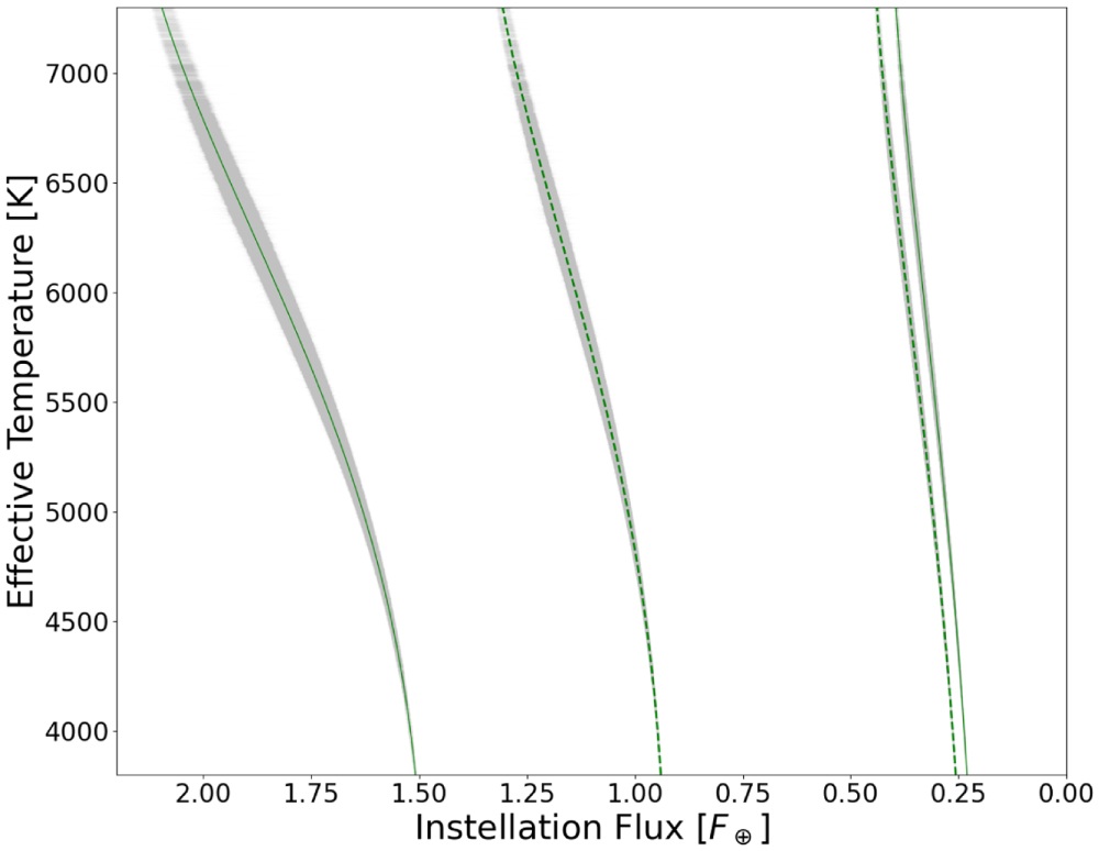 Standard image High-resolution imageOur calculation of HZ occurrence will be in terms of planet radius and instellation flux, measuring the photon flux incident on the planet from its host star, which allows us to consider each star's HZ. We will proceed in two steps: