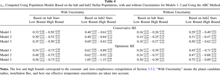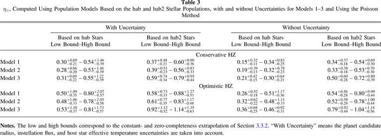 , respectively, specifically refer to occurrence in the conservative and optimistic HZs. Additional subscripts on η⊕ refer to different stellar populations. For example