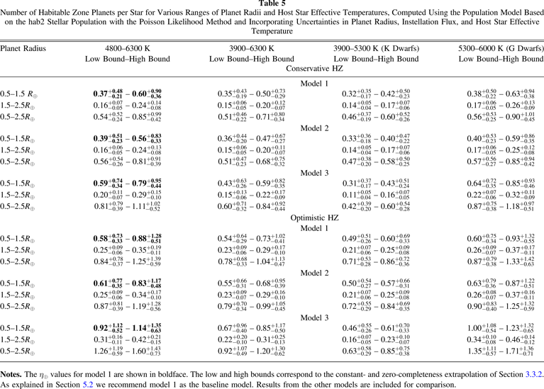 Once we have our population models, we will use them to compute our definition of η⊕, the average number of planets per star with radii between 0.5 and 1.5 R⊕, in the star's HZ, averaged over stars with effective temperatures from 4800 to 6300 K. In the end we will find that the two stellar populations predict similar median values for η⊕, but the model using stars with effective temperatures from 3900 K to 6300 K yields significantly smaller (though still large) uncertainties. While we are focused on our definition of η⊕, occurrence rates over other ranges of planet radii and stellar temperatures are of interest. We will use a population model based on the 3900–6300 K stellar population to compute the average number of HZ planets per star for various ranges of planet radii and stellar effective temperatures.