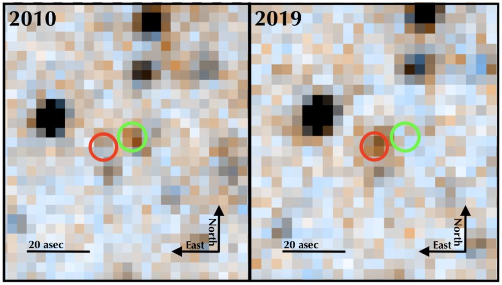 Figure 1. The movement of J0523−0153 from WISE in 2010 through NEOWISE in 2019. The green circle shows the position of J0523−0153 in 2010, and the red circle shows it in 2019.