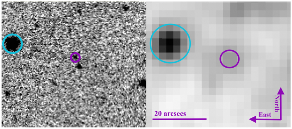Figure 2. VISTA Hemisphere Survey (DR6) J-band image is on the left alongside the WISE W2-band image on the right. Both figures show the same patch of sky at the same scale, which is indicated on the right-hand panel. The purple circle is J0523−0153 and the blue circle is a nearby object that can be used as a reference.