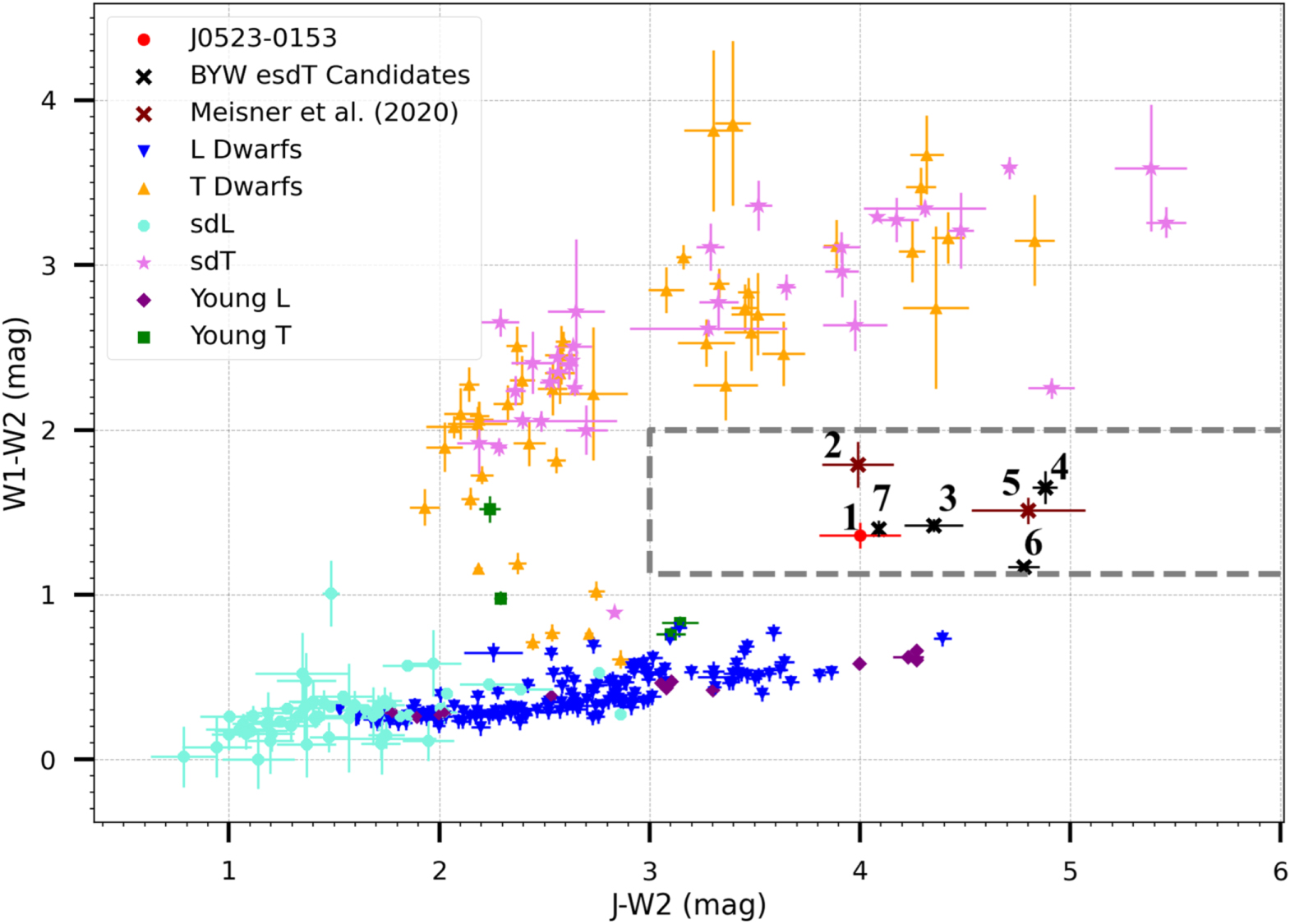 Figure 3. Color−color diagram adapted from Figure 1 of Meisner et al. (2021) and Kirkpatrick et al. (2016). The gray box was described in Meisner et al. (2021) to contain all known esdTs and candidates; therefore, we call it the esdT box. The location of J0523−0153 (red circle) places it well within the esdT box. L dwarfs (blue downward triangles), T dwarfs (orange upward triangles), young L (purple diamonds), young T dwarfs (green squares), L subdwarfs (light blue circles), and T subdwarfs (pink stars) from the 20 pc L, T, and Y dwarf sample of Kirkpatrick et al. (2021a) are shown for comparison, as are the extreme T subdwarf candidates from the BYW papers (black crosses) of Schneider et al. (2020) and Meisner et al. (2021). WISEA J153429.75−104303.3 (Kirkpatrick et al. 2021b) has a large J − W2 color, falling at a J − W2 value that is too red for this graph. Both CWISEP J050521.29–591311.7 and CWISEP J090536.35+740009.1 from Meisner et al. 2020 are shown by maroon crosses. Objects in the esdT box are: 1: J0523−0153, 2: J0905+7400, 3: J0414−5854, 4: J2217−1454, 5: J0505−5913, 6: J1810−1010, and 7: J0738−6643 (all of these objects can be found in Table 2).