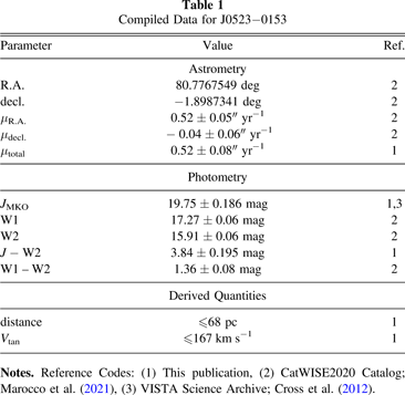 J0523−0153 is shown in Figure 1 to have a significant proper motion, and this is measured in the CatWISE2020 Catalog as μR.A. = 0.52 ± 0.05'' yr−1, μdecl. = −0.04 ± 0.06'' yr−1, and μtot = 0.52 ± 0.08'' yr−1. Using our poorly constrained distance estimate of ≤68 pc, we find a tangential velocity of ≤167 km s−1.