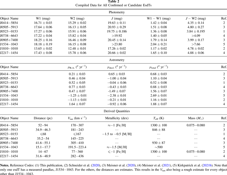 Notes. Reference Codes: (1) This publication, (2) Schneider et al. (2020), (3) Meisner et al. (2020), (4) Meisner et al. (2021), (5) Kirkpatrick et al. (2021b). Note that only one esdT has a measured parallax, J1534−1043. For the others, the distances are estimates. This results in the Vtan also being a rough estimate for every object other than J1534−1043.