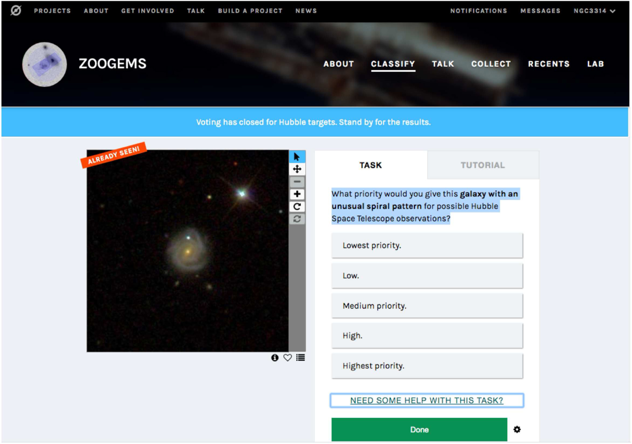Figure 1. Screen capture of the voting interface for Galaxy Zoo targets. Clicking on "Need some help with this task?" displayed a longer description and a montage of all galaxies in the same voting category. The red banner at upper left indicates that a user has already seen this object.