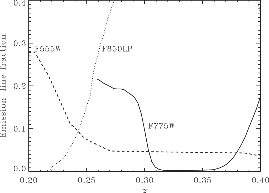 Figure 2. Emission-line contribution in the F555W, F775W, and F850LP passbands for a typical Green Pea spectrum, SDSS J131036.73+214817.0 at z = 0.2832, evaluated at various redshifts, showing the range near z = 0.24 where both the very broad F555W and F850LP filters have <10% contribution from emission lines, and the very deep minimum in the F775W filter from z = 0.32–0.36 where the contamination from line emission is well below 1%.