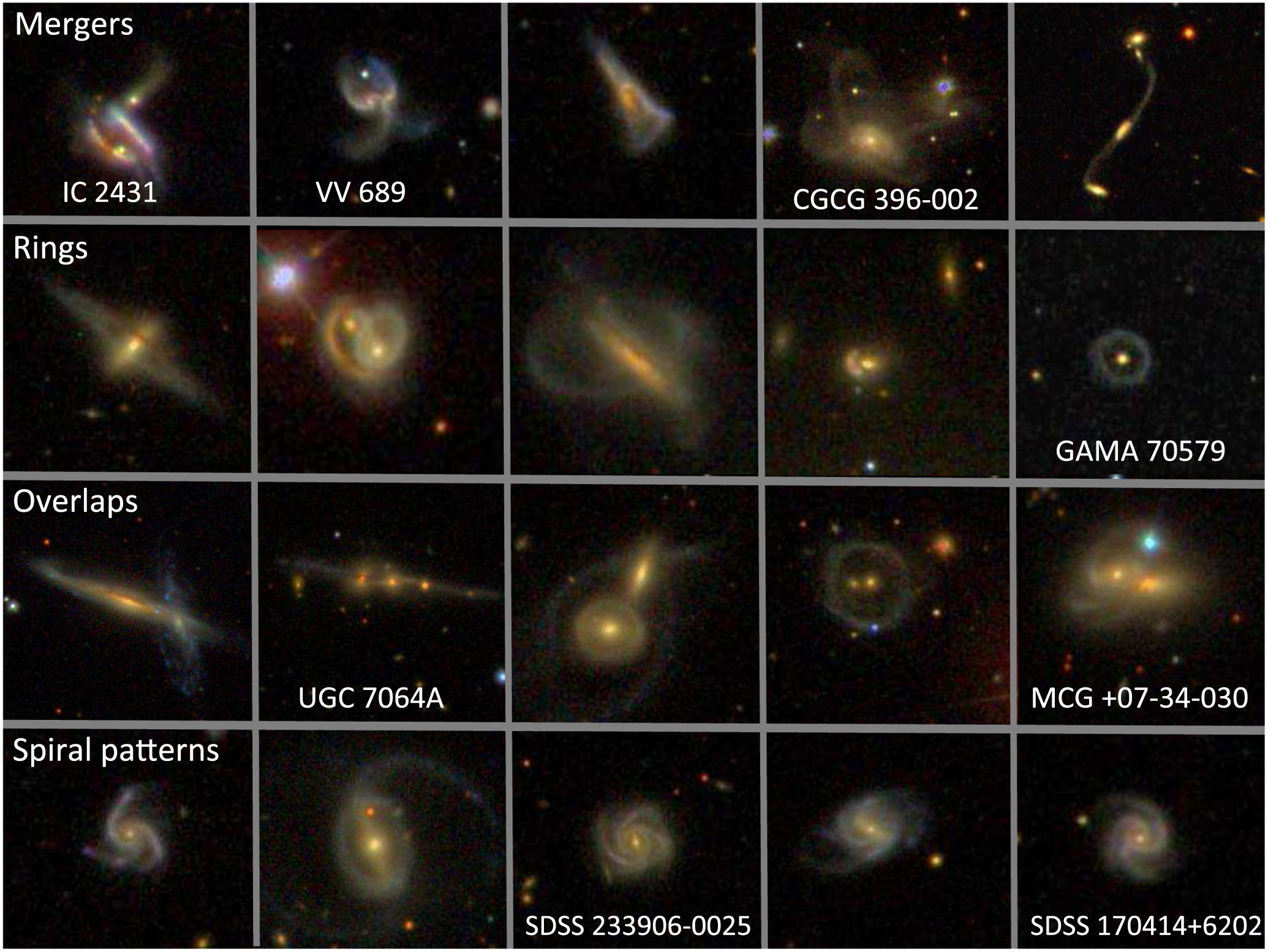 Standard image High-resolution imageFigure 3. Montage of SDSS gri images of galaxies highest-ranked in the voting among four large categories. Object names are shown for those that have been observed at the time of submission.