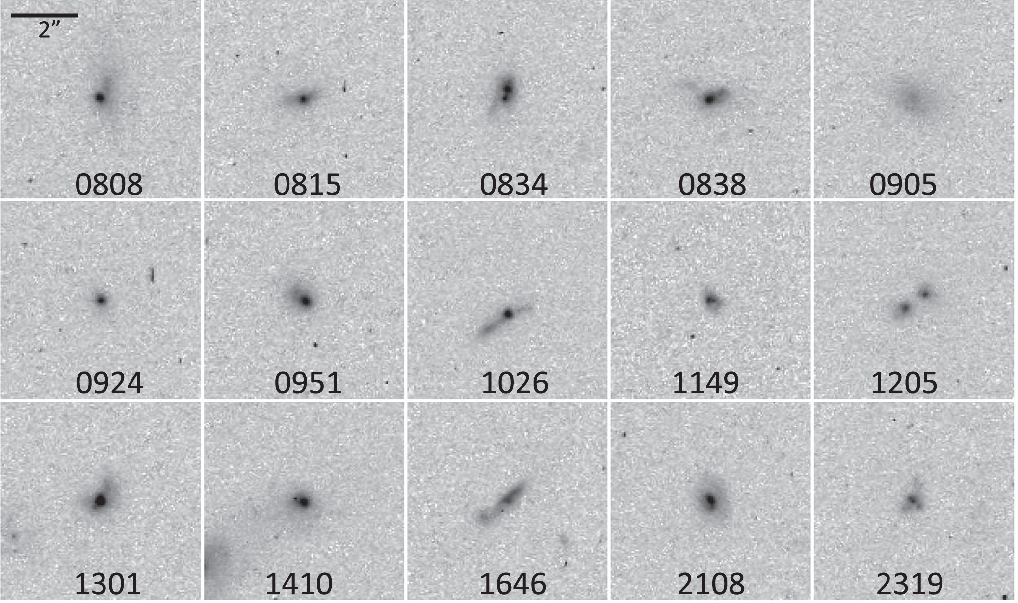 Figure 4. The first 15 Green Pea systems observed in single filters, as listed in Table 2. Abbreviated names showing the first four digits of the R.A. are used for convenience. Each panel is a 6 × 6'' region, typically 24 × 24 kpc, and all are shown to the same intensity scale, logarithmic above a slight negative offset. North is up, and east to the left in each case. The 2'' scale bar matches the limiting Petrosian radius from SDSS data used in the sample selection. All were observed in the F775M band except 0815, 0905, and 0924, observed in F850LP.