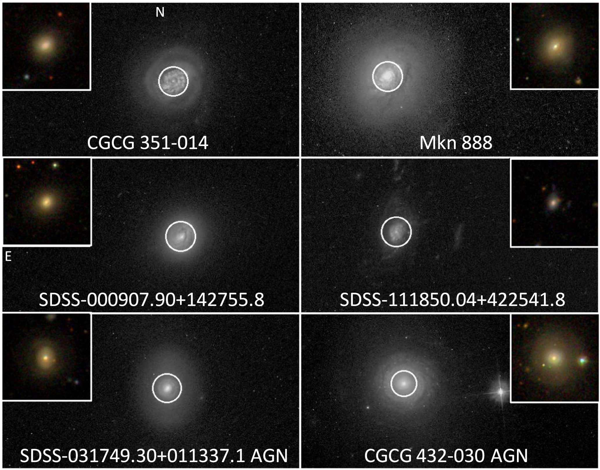 Figure 5. Blue early-type galaxies, in the F475W filter to emphasize young stellar populations. The bottom two are classified as having spectroscopic AGN by the SDSS automated system. Each galaxy shows a tightly wound spiral pattern near the nucleus; the superimposed circles have radius 2