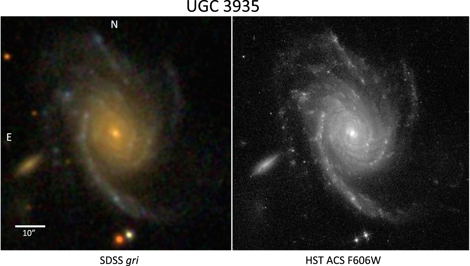 Figure 6. Red spiral galaxy UGC 3935, comparing the usual gri composite from SDSS data with the HST ACS F606W image. The region shown is 77'' × 78'' with north at the top.