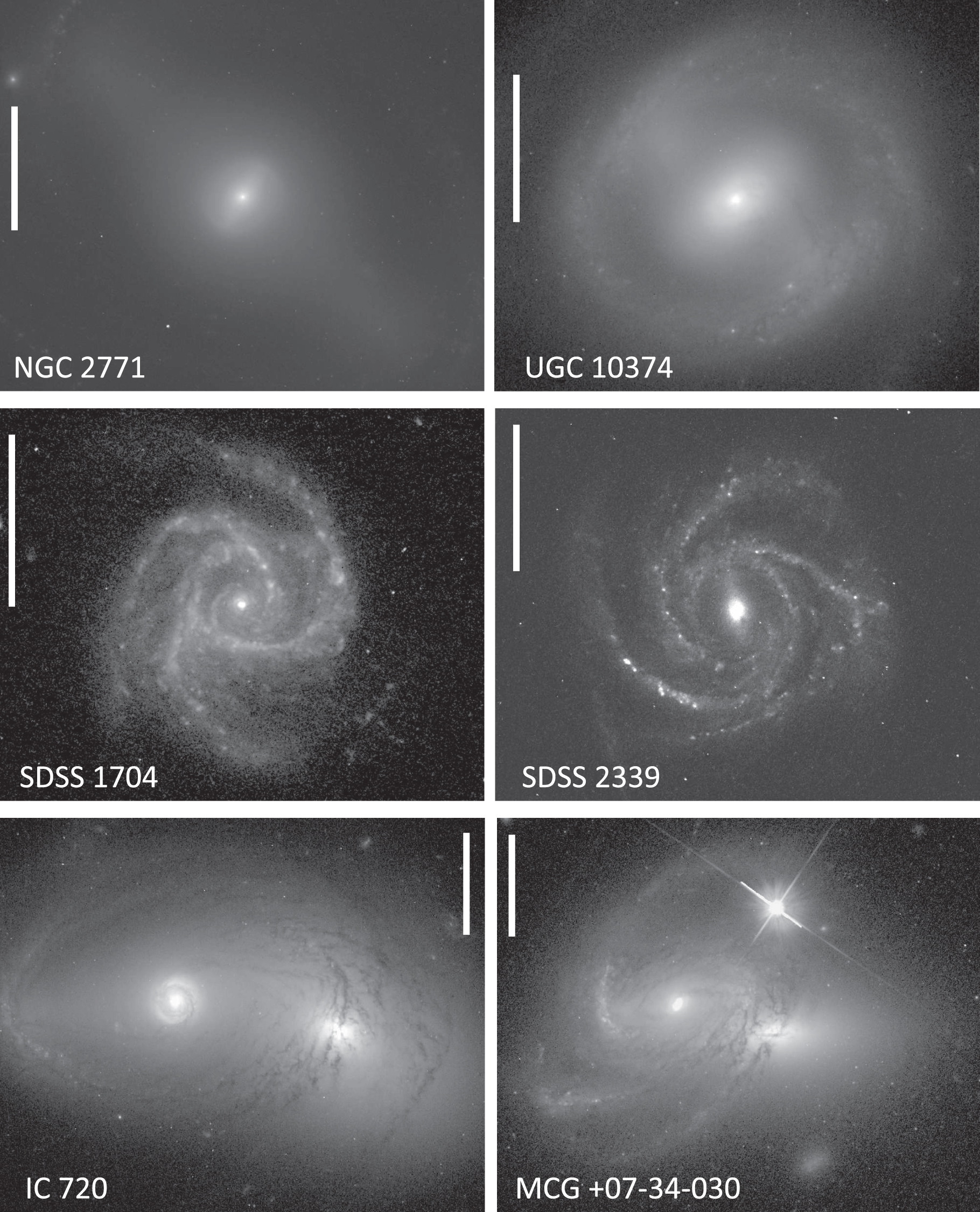 Figure 7. Some of the kinds of disk structures included in Zoo Gems data. Top row: nuclear bars and bar lenses. Middle row: three-armed spirals. Bottom row: backlit spiral arms and disk with dust attenuation. All images have north at the top and east to the left; vertical white scale bars indicate 10'' in each case. The gray scale is logarithmic, with zero levels and contrast tailored to show the structures in each object. In the object names, SDSS destinations are truncated for legibility.
