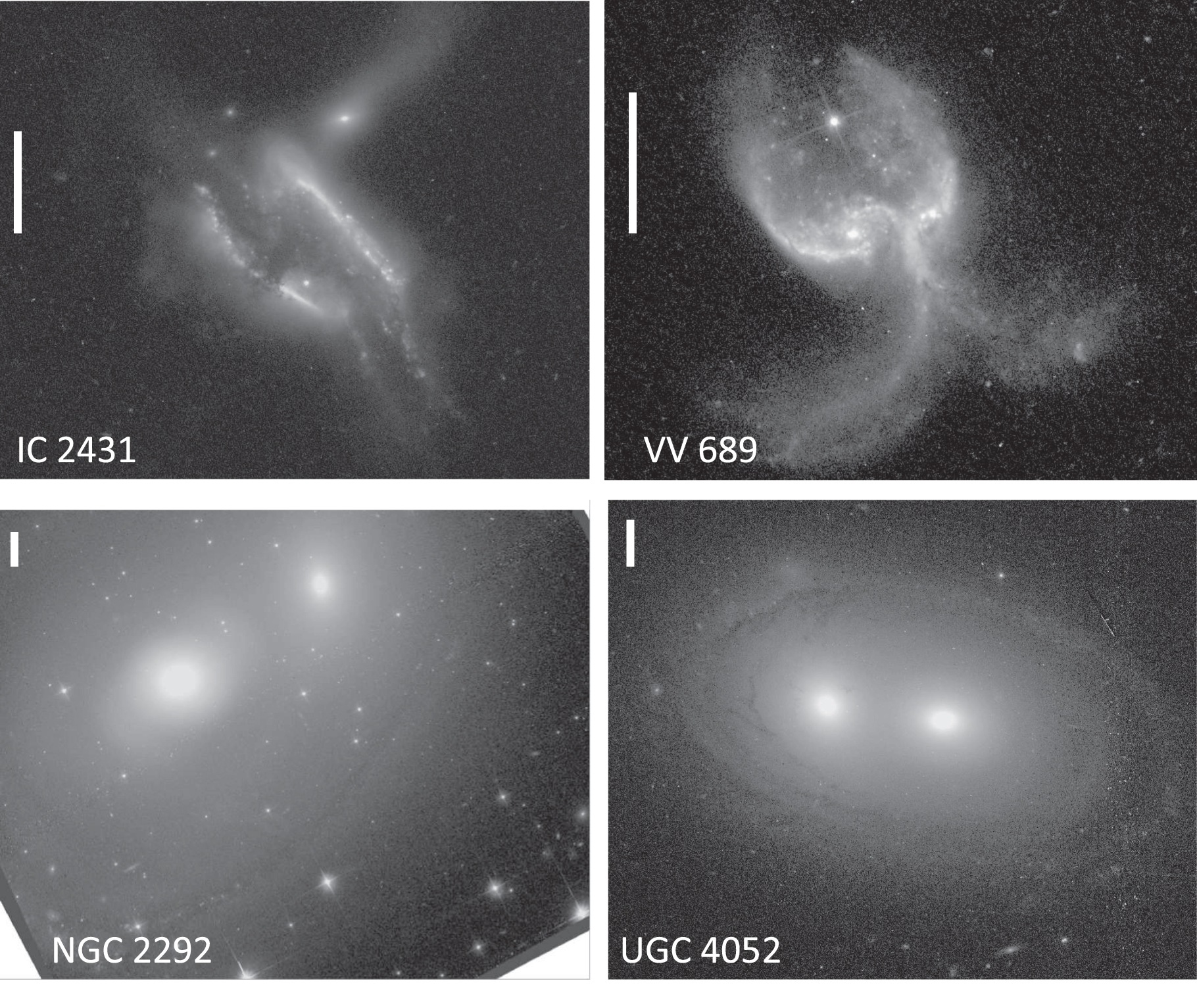 Figure 9. Montage of merging galaxies, including two typical mergers (upper row) and two potential regrowing disks (lower row). The layout is as in Figure 7, with 10'' scale bars. The regrowing disks illustrated here span large enough areas on the sky to include the stripe of cosmic-ray events across the middle, where only a single exposure was obtained as the telescope made a dither motion to give double coverage elsewhere. For NGC 2292, the edges of the ACS combined field appear in the corners.