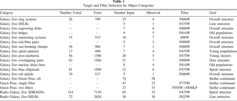 Table 1 lists the number of target objects in each category, and the number observed as of submission of this paper. Only primary categories are given, although some fit in multiple categories. For example, all five of the Galaxy Zoo EELR systems occur in interacting galaxies, and one Radio Galaxy Zoo lens candidate lies in the same ACS field as the Galaxy Zoo EELR candidate SDSS J160646.74+565139.2. For categories where targets were selected by voting, the table also lists the number of objects voted on in each category and the number of votes received. "Number input" is the number of targets from that category included in the final observing list, and "Observed" is the number actually observed to date.