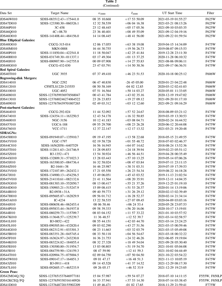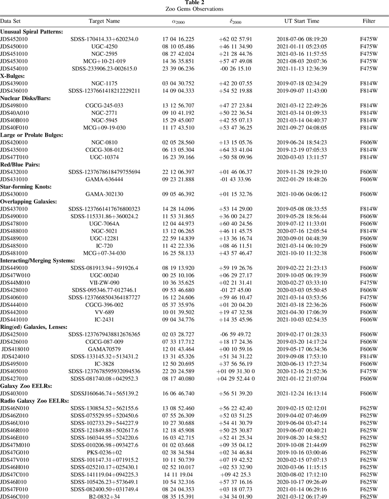 The Zoo Gems observations to date are listed in Table 2, organized by science topic and observation date. As of 31 January 2022, 146 objects had been observed, 49% of the input list. The total exposure time in each case is 674 s, in two dithered exposures when a single filter was used, or two individual 337 s exposure for those Green Peas with two filters listed. For these two-filter objects, we list the final two characters of the second data set identifier after the complete identifier for the first exposure. In a few cases, one exposure was terminated onboard before the planned duration.