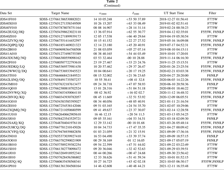 | JDS43DUMQ/NQ | SDSS-1237666300559098162 | 03 53 32.464 | -00 10 28.88 | 2019-11-14 06:16:30 | F555W, F850LP |