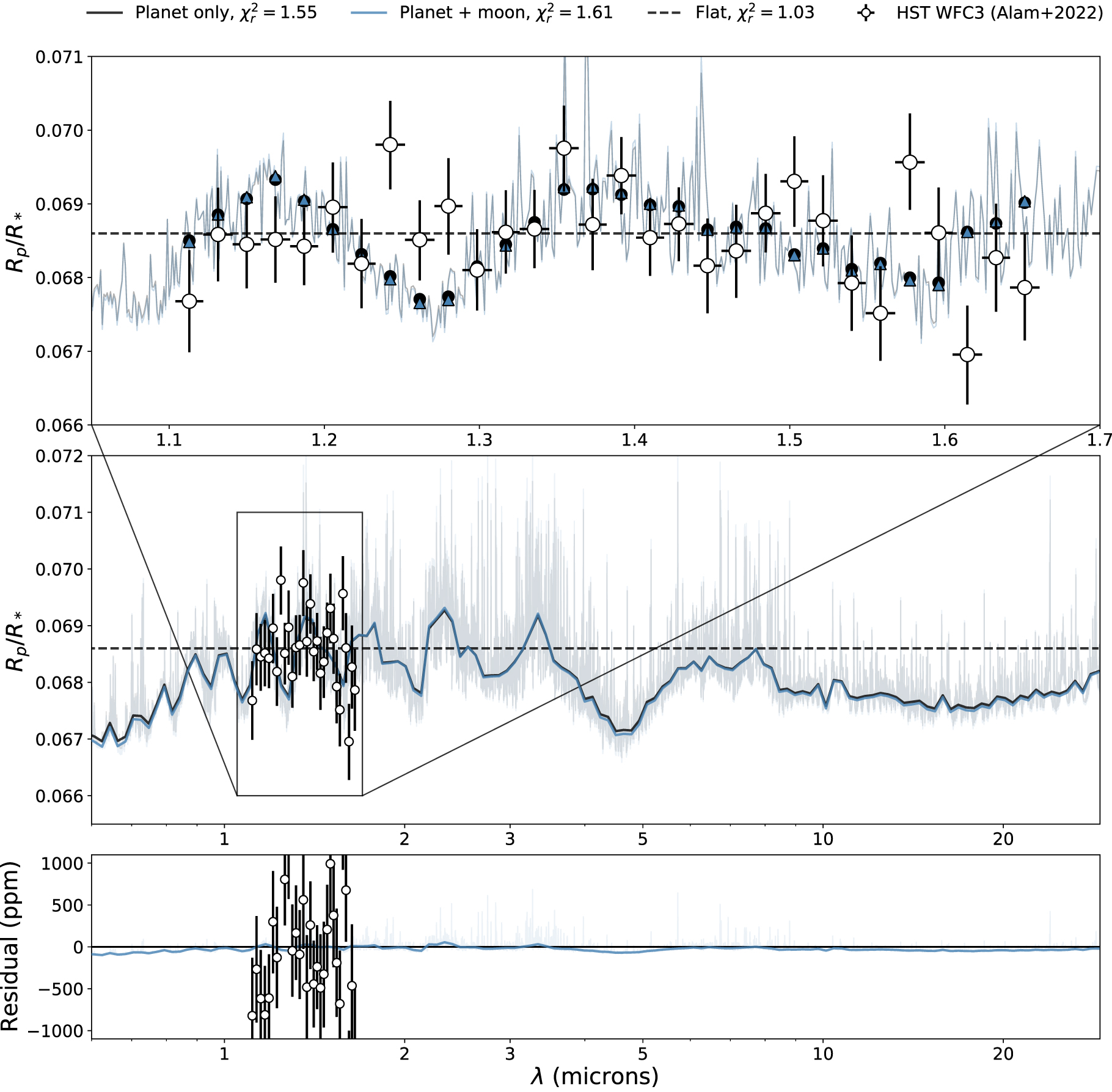 where ${({R}_{{\rm{p}}}/{R}_{\star })}_{\mathrm{eff}}$ is the effective planet-to-star radius ratio due to the planet and moon, and δp and δs are the wavelength-dependent transit depths due to the planet and moon, respectively. Similar to before, we then performed a least-squares fit to the observed spectrum from Alam et al. (2022), preserving the shape of the total spectrum by fitting only for a constant offset in Rp/R. Both models are shown alongside the observations in Figure 6, along with the residual Rp/R between the planet-only and combined planet-moon models.