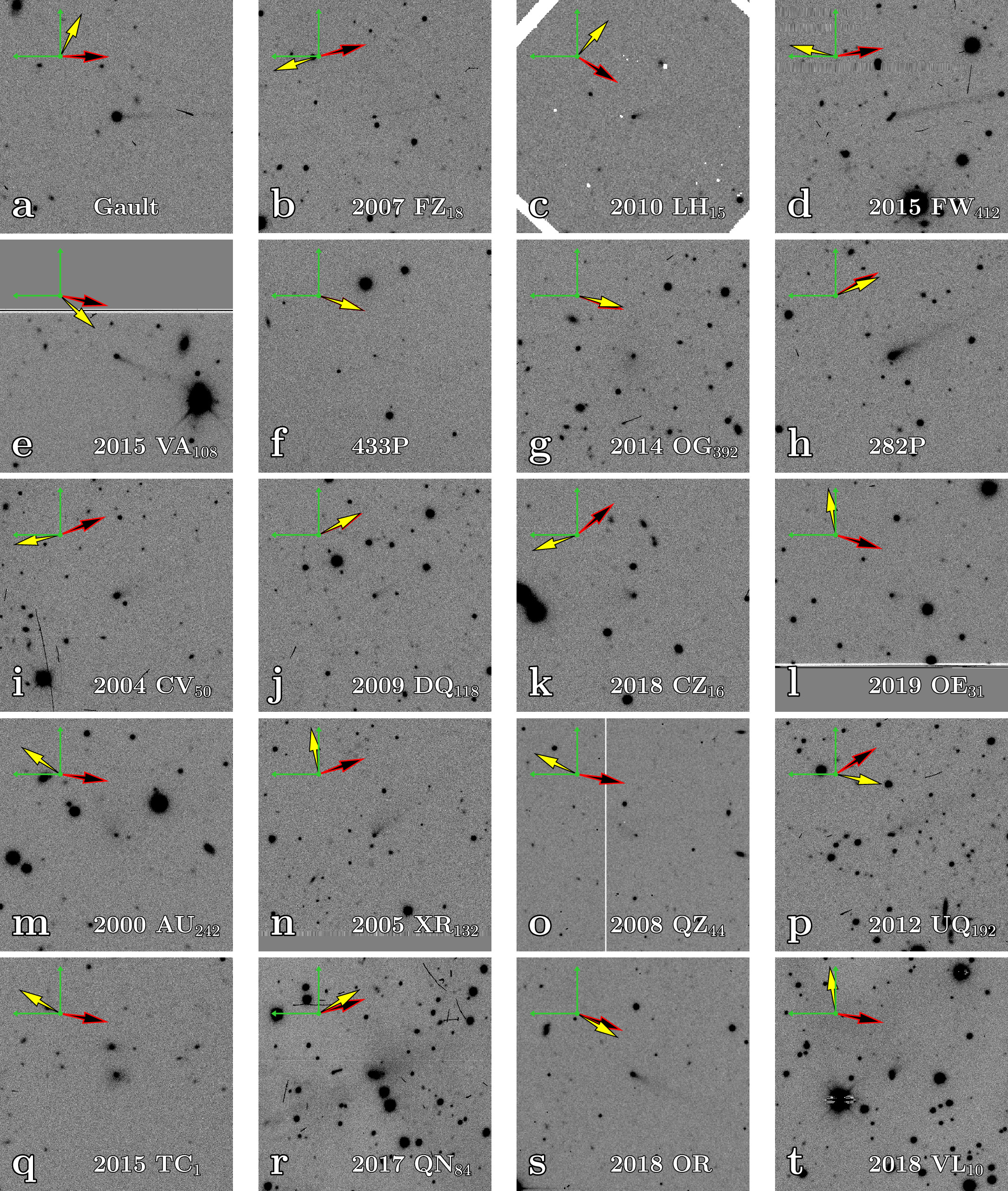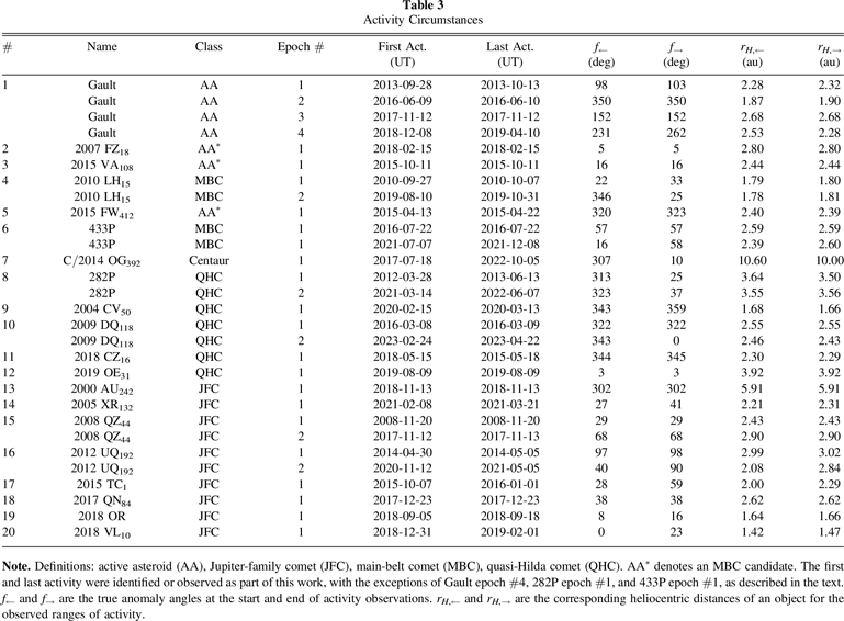 Note. Definitions: active asteroid (AA), Jupiter-family comet (JFC), main-belt comet (MBC), quasi-Hilda comet (QHC). AA* denotes an MBC candidate. The first and last activity were identified or observed as part of this work, with the exceptions of Gault epoch #4, 282P epoch #1, and 433P epoch #1, as described in the text. f← and f→ are the true anomaly angles at the start and end of activity observations. rH,← and rH,→ are the corresponding heliocentric distances of an object for the observed ranges of activity.