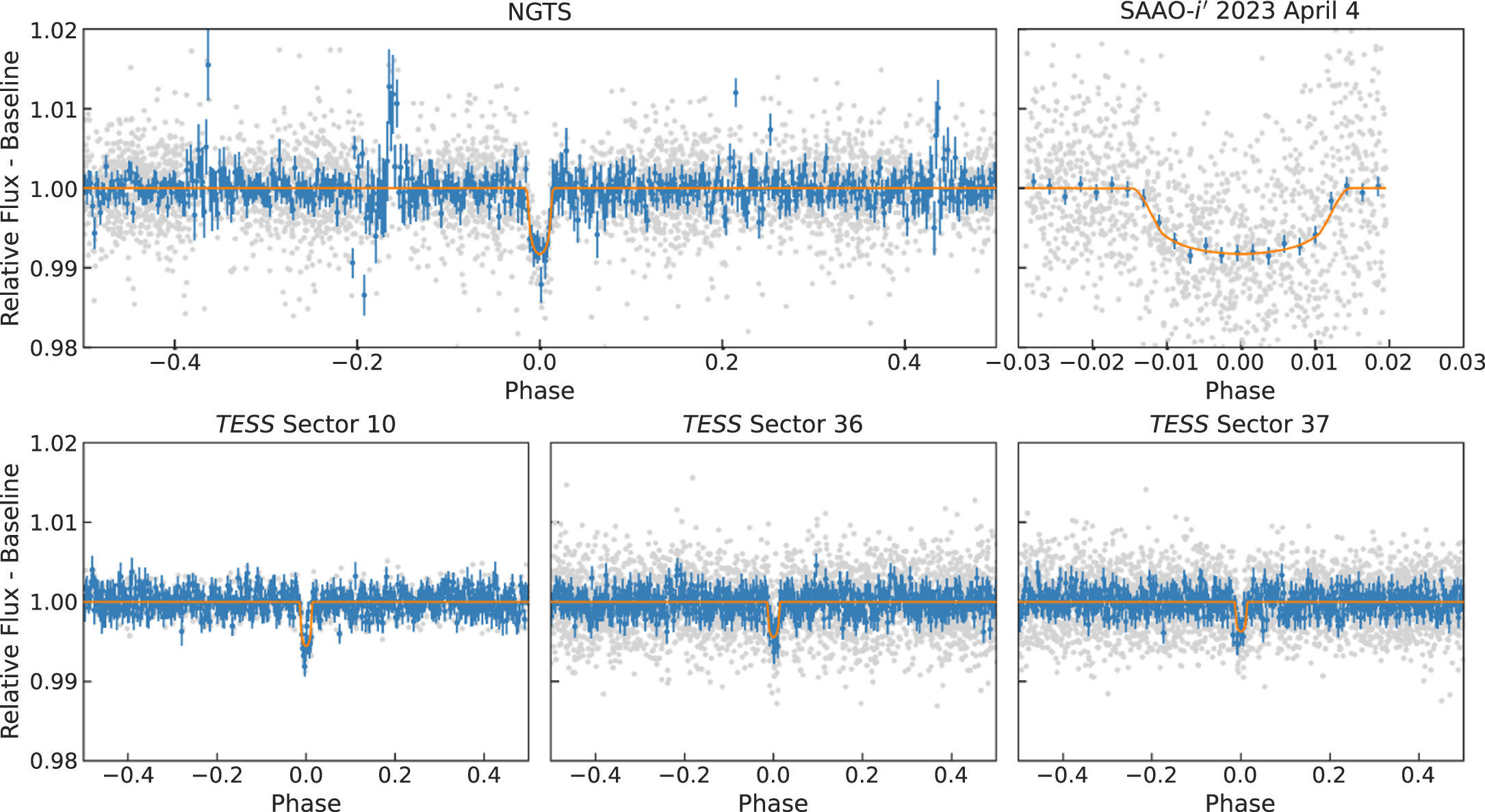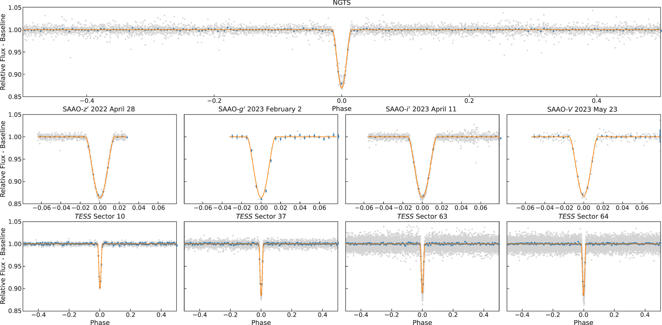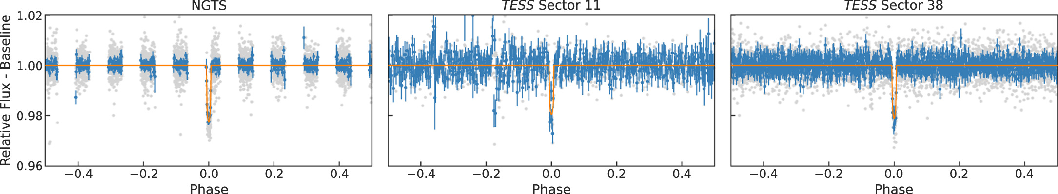 The NGTS (Wheatley et al. 2018) is an array of 12 robotically operated telescopes located at the Paranal Observatory in Chile. Each telescope has a 20 cm aperture and a field of view of 8 deg2. The primary goal of NGTS is to survey large sections of the sky in search of exoplanet transits (Bayliss et al. 2018). Since 2018, NGTS has also been used extensively for exoplanet follow-up observations, particularly for TESS mission candidates (e.g., Armstrong et al. 2020). NGTS operates using a custom filter with a bandpass from 520 to 890 nm, maximizing sensitivity to late-K- and early-M-dwarf stars. The NGTS facility is designed to be sensitive to transit depths of 0.1% in order to detect Neptune-sized planets around Sun-like stars. The discovery of NGTS-4b with a transit depth of 0.13% represents the shallowest transiting system ever discovered from the ground (West et al. 2019).