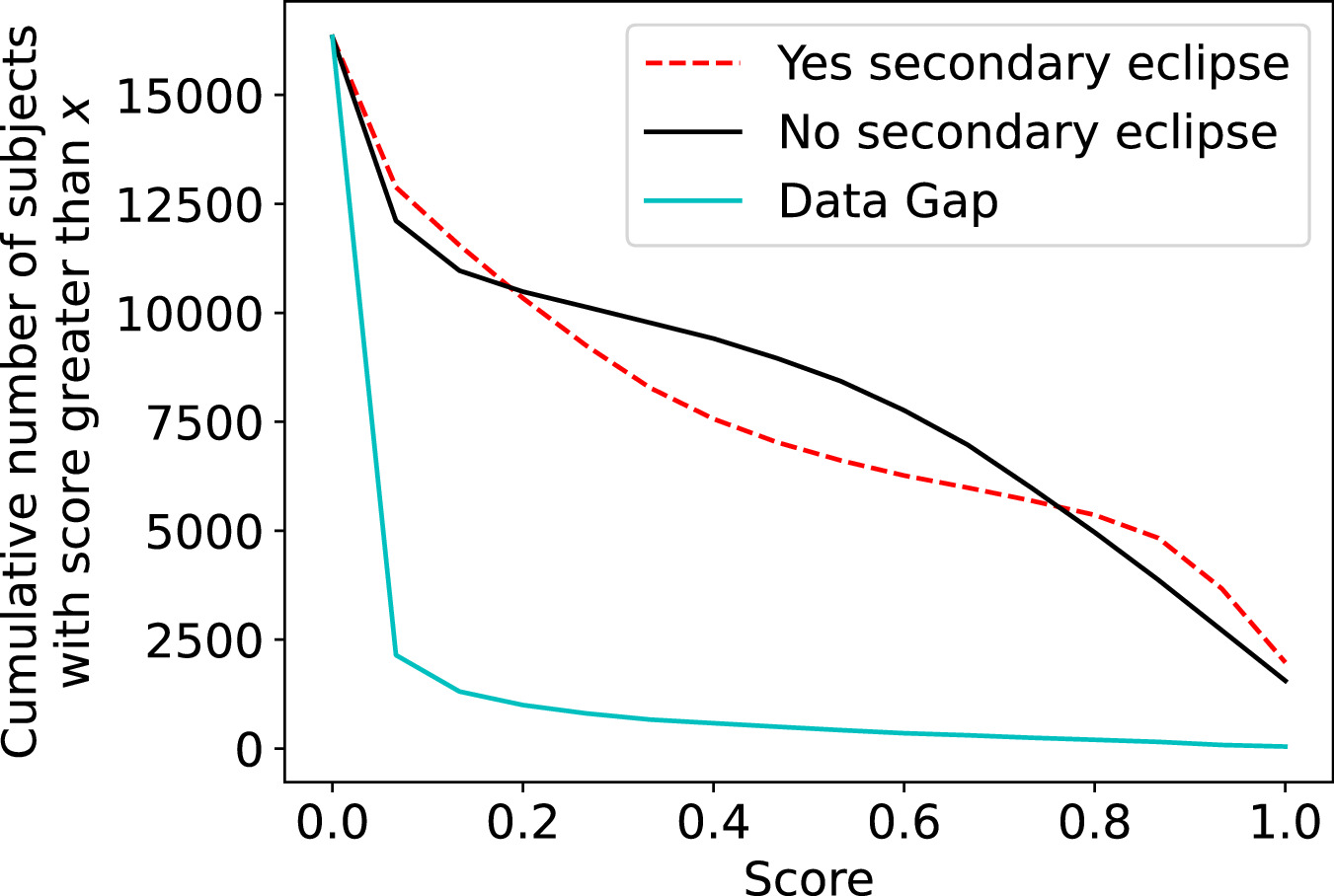 Figure 17. Cumulative distribution of subject scores greater than the given score on the x-axis for the Secondary Eclipse Check.