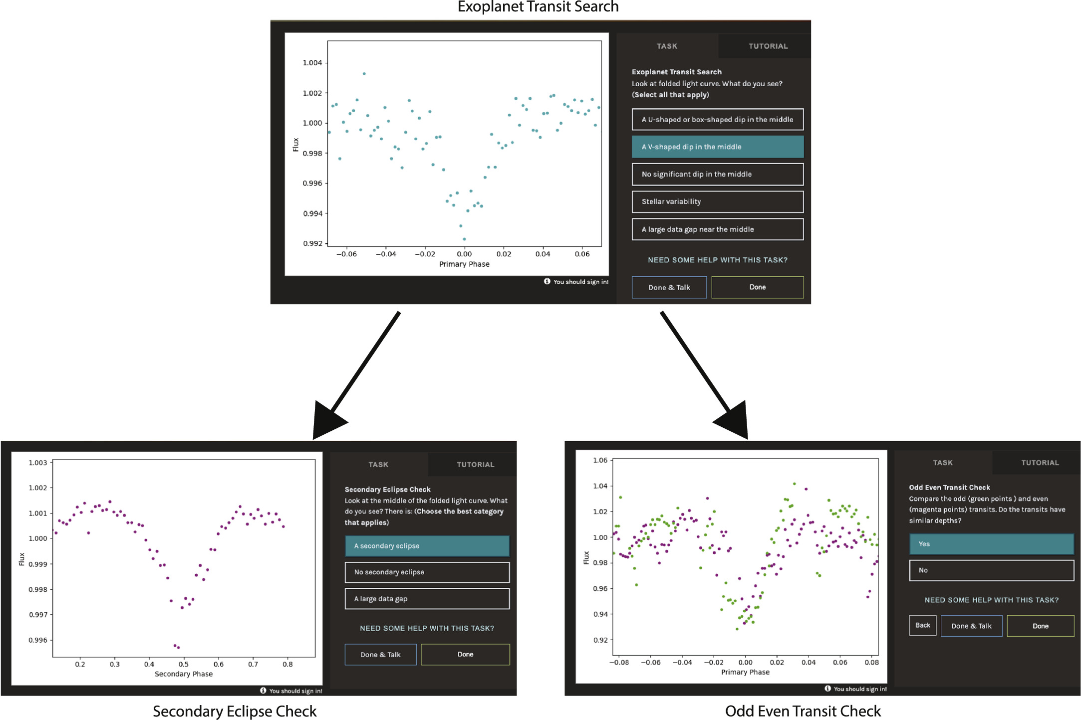 Figure 1. PHNGTS classification interfaces. Top panel: Exoplanet Transit Search interface showing a phase-folded light curve with the response "A V-shaped dip in the middle" selected. Bottom-left panel: Secondary Eclipse Check interface showing the phase-folded light curve centered on phase = 0.5 with the response "A secondary eclipse" selected. Bottom-right panel: second task of the Odd/Even Transit Check workflow asking whether the green points (odd transits) and magenta points (even transits) have similar depths, the selected response is "Yes." Note the example images for each workflow do not show data for the same star.