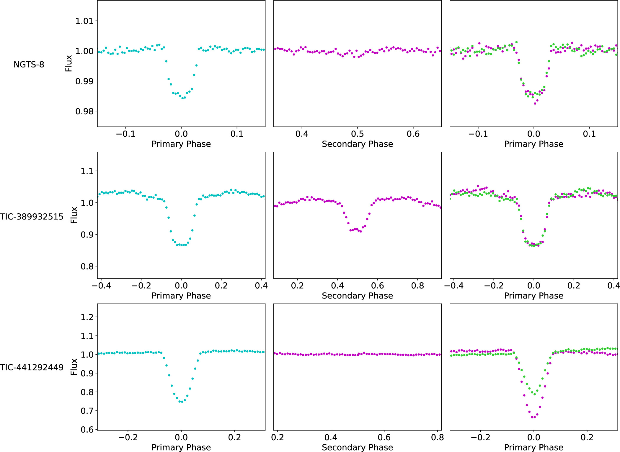 Figure 2. Light curves for three different stars as presented in each of the three workflows. Top row: light curves for NGTS-8, which shows a clear U-shaped transit in the Exoplanet Transit Search. No secondary eclipse is visible in the Secondary Eclipse Check, and the depths of the odd and even transits match in the Odd/Even Transit Check. Middle row: light curves for TIC-389932515, which shows a U/V-shaped transit in the Exoplanet Transit Search. The depths of the odd and even transits match in the Odd/Even Transit Check; however, a secondary eclipse is visible in the Secondary Eclipse Check, indicating this is an eclipsing binary. Bottom row: light curves for TIC-441292449, which shows a clear V-shaped transit in the Exoplanet Transit Search. No secondary eclipse is visible in the Secondary Eclipse Check; however, the depths of the odd and even transits do not match in the Odd/Even Transit Check, indicating this is an eclipsing binary.