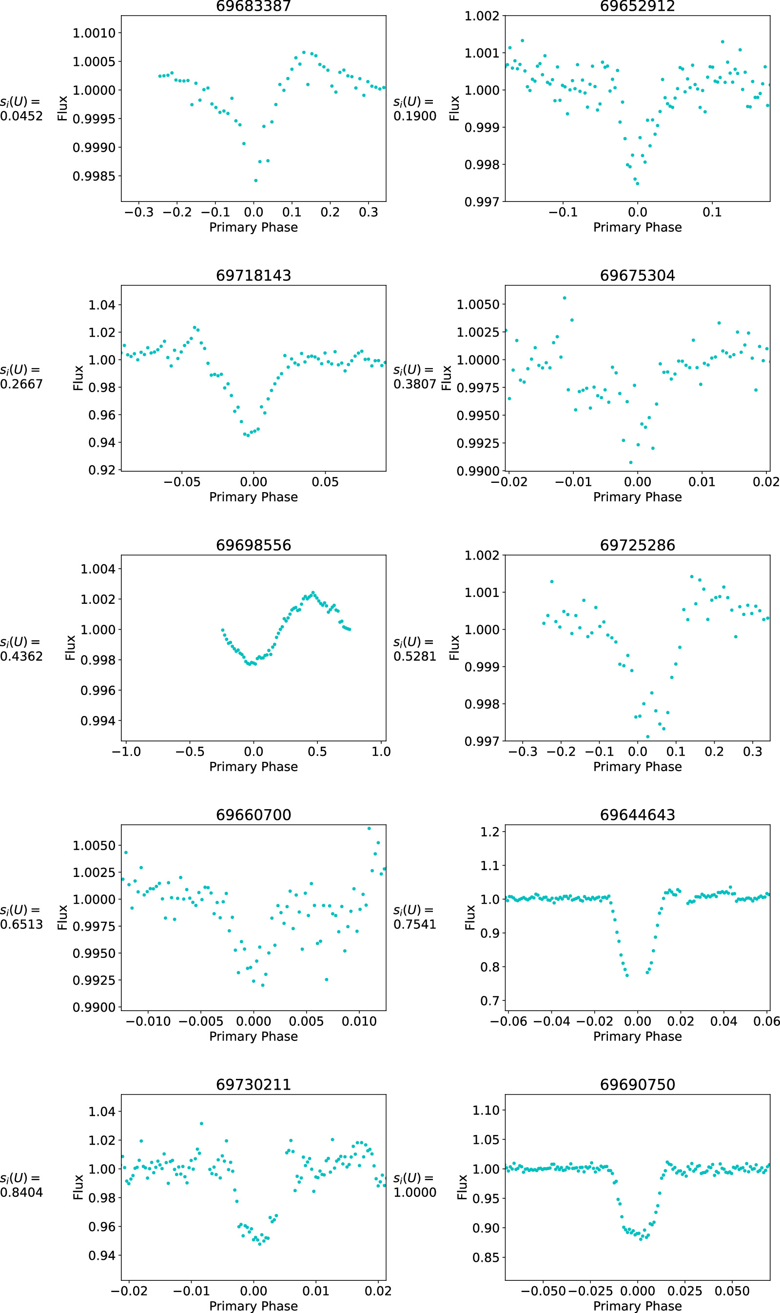 Figure 6. Random sample of Exoplanet Transit Search subjects per U-shaped score si (U) binned with bin size of 0.1. The x-axes show Phase and the y-axes show Normalized Flux. Titles display Subject ID. The U-shaped subject score, si (U), is shown to the left of each image.