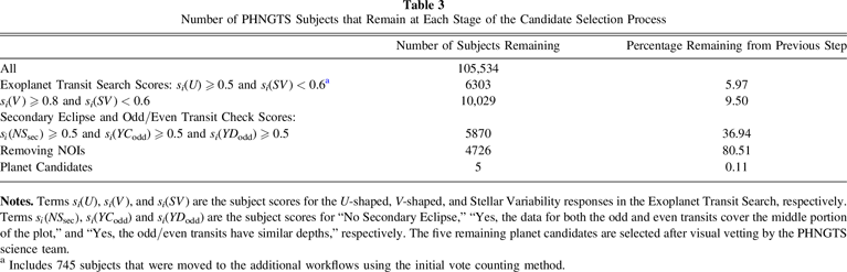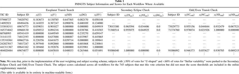 In this section, we describe the user weighting and subject scoring scheme used to combine multiple user classifications and select the best candidates to be advanced from the Exoplanet Transit Search to the additional workflows and then to the visual vetting stage.