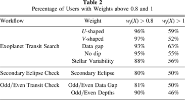 These subject scores can be in the range [0, 1], with a score of 1 indicating unanimous agreement that the given feature is present and a score of 0 meaning that all users agreed that the given feature is not visible in the subject presented. As in the Exoplanet Transit Search, all user weights are initially set to 1 and the weights of users who classified only one subject remain as 1. Once the subject scores have been calculated, we assign new user weights as follows: