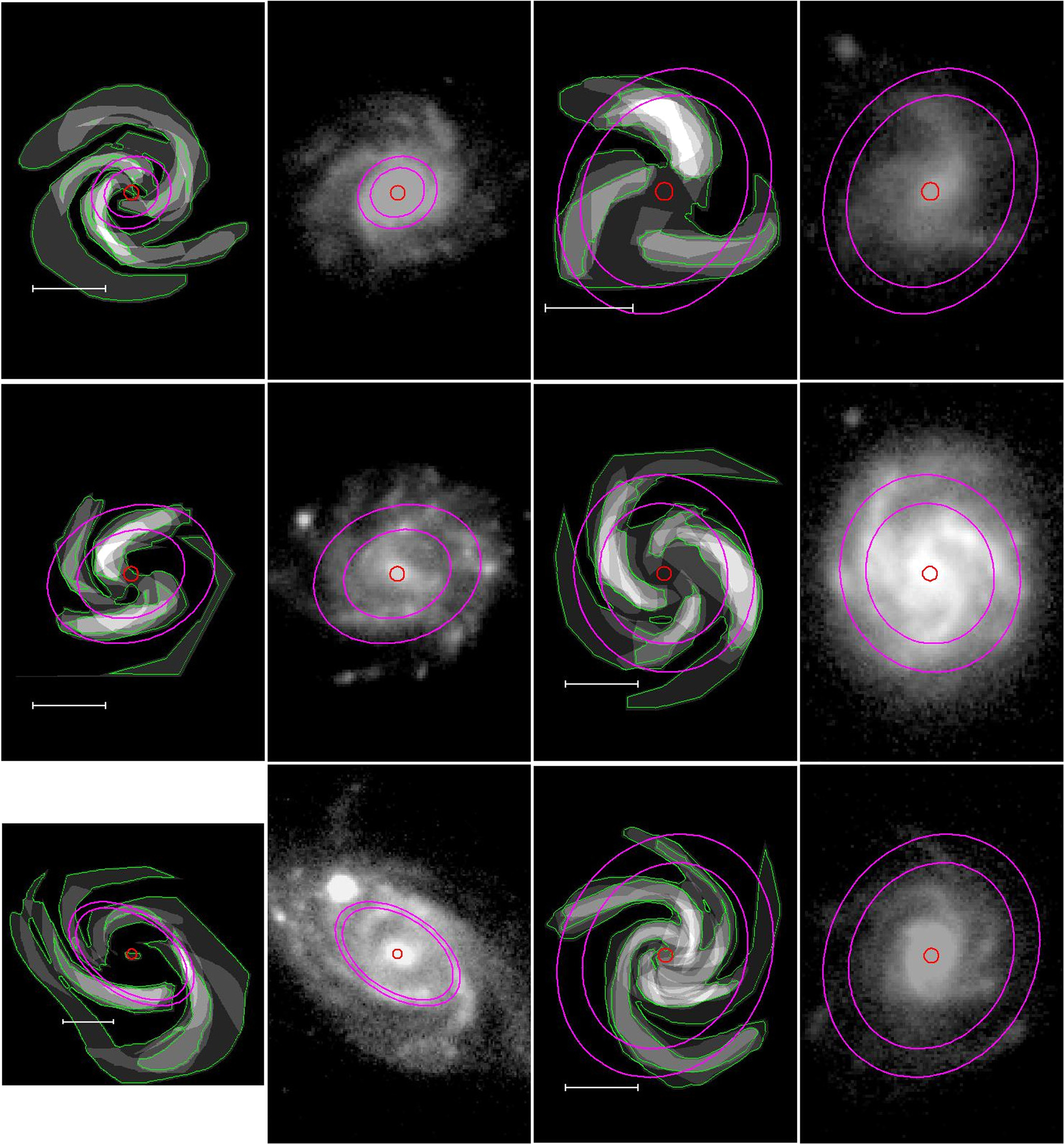 Figure 12. Examples of six galaxies identified by the code as grand design and confirmed by eye. The first picture of each galaxy is the GZ-3D mask, the second picture is the SDSS g-band image. The two green contours on the GZ-3D masks correspond to one and three counts. The magenta ellipses show the inner and outer radii of the largest continuous radial range marked as two-armed by our software. The red circle indicates the center of the galaxy as marked by GZ-3D participants. On the SDSS g-band images, the same circle and ellipses are overlaid. In order left to right, top to bottom, the galaxies are as follows: MaNGA ID 1-1811 = IAU J101927.42-000204.3; MaNGA ID 1-32942 = IAU J010650.99-003413.7; MaNGA ID 1-260943 = IAU J141031.43 + 385353.8; MaNGA ID 1-555127 = IAU J023421.64-075224.2; MaNGA ID 1-567320 = IAU J094120.45 + 211656.9; and MaNGA ID 1-605134 = IAU J081752.00 + 125350.9. The white scale bars are 10''.