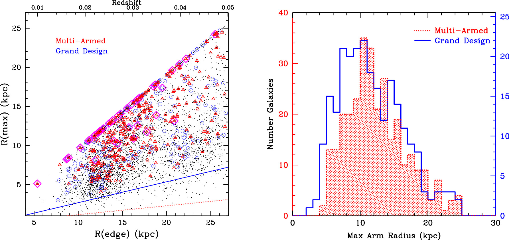 Figure 14. Left: plot of R(max), the maximum distance out to which we trace spiral arms, vs. R(edge), the edge of the GZ-3D field of view. The small black dots are all of the galaxies in the z < 0.05 GZ-3D sample for which we are able to mark spiral arms. Red open triangles mark the galaxies that we classified as multiarmed. Blue open circles are galaxies classified as grand design. Magenta open diamonds mark galaxies which have R90/R(edge) > 1.2. These are galaxies that are physically large compared to the GZ-3D field of view. The red dotted line is the minimum R(max) possible for galaxies flagged as three-armed. The blue solid line is the minimum R(max) possible for a galaxy defined as grand design by our definition. Right: histograms of the maximum radius out to which we are able to reliably mark spiral arms (i.e., at a threshold = 3) for the multiarmed galaxies (red hatched histogram) and the grand design galaxies (blue).