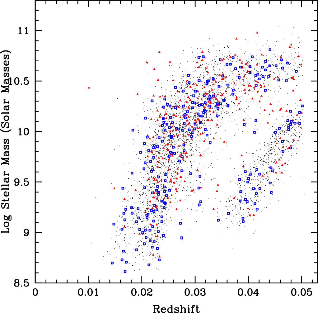 Figure 1. Stellar mass vs. redshift for our grand design (blue open squares) and multiarmed galaxies (red filled triangles). Other galaxies in our initial set of 4449 GZ-3D galaxies with z < 0.05, ellipticity ≤0.5 are marked by small black dots. The galaxies in the "Primary" and "Secondary" MaNGA subsets are separated into two "bands" in this plot, with the larger-angular-size "Primary" galaxies in the leftmost band.