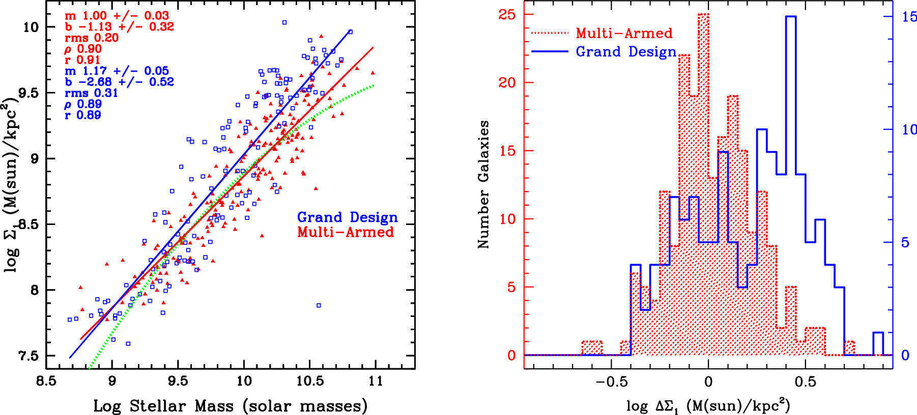 Figure 7. Left: plot of log Σ1 vs. log M* for the multiarmed (red filled triangles) and grand design (blue open squares) galaxies. The red line is the best-fit line for the multiarmed galaxies; the blue line is the best-fit line for the grand design galaxies. The parameters of the fits are given in the corresponding colors. The green dotted curve is the Luo et al. (2020) dividing line between galaxies with classical bulges (above the curve) and pseudo-bulges (below). Right: log ΔΣ1 for multiarmed (red hatched) and grand design (blue) galaxies, where log ΔΣ1 is defined by Luo et al. (2020) as the offset from the green curve in the left panel. Galaxies that lie to the right of zero in these histograms lie above the green curve in the plot on the left. The left axis gives the number of galaxies for the multiarmed sample, while the right axis gives the number of grand design galaxies.