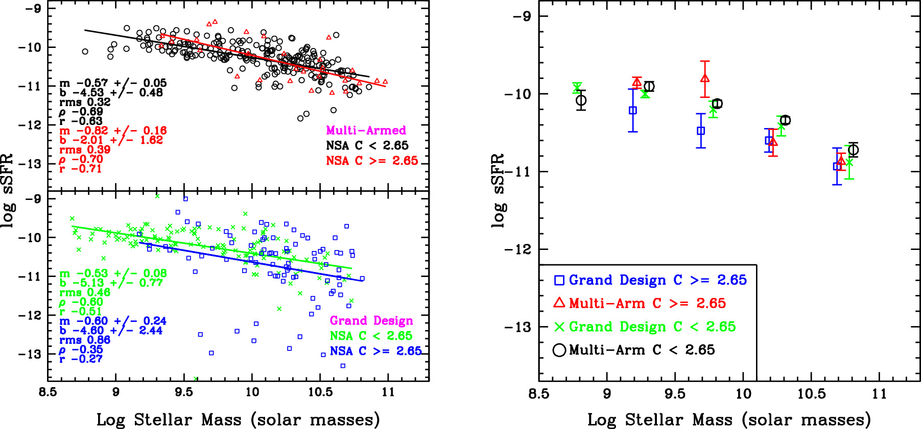 Figure 8. Plots of the log of the sSFR vs. log M*. The left panels show the positions of individual galaxies, with grand design galaxies in the top panel and multiarmed galaxies in the bottom panel. In the panels on the left, the best-fit line for each subset and its parameters are shown in the corresponding color. The right panel gives the median sSFR for each subset as a function of log M*, within 0.3 dex bins in log M*. The sample is split into four subsets: blue open squares, grand design, NSA C ≥ 2.65; green crosses, grand design, NSA C < 2.65; red open triangles, three-armed, NSA C ≥ 2.65; black open circles, three-armed, NSA C < 2.65. In the right panel, the four subsets for a given log M* are slightly shifted along the x-axis for ease in viewing. The error bars in the right panel give the error in the median ∼IQR/