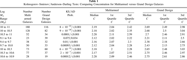 Standard image High-resolution imageTable 1. Kolmogorov–Smirnov/Anderson–Darling Tests: Comparing Concentration for Multiarmed versus Grand Design Galaxies