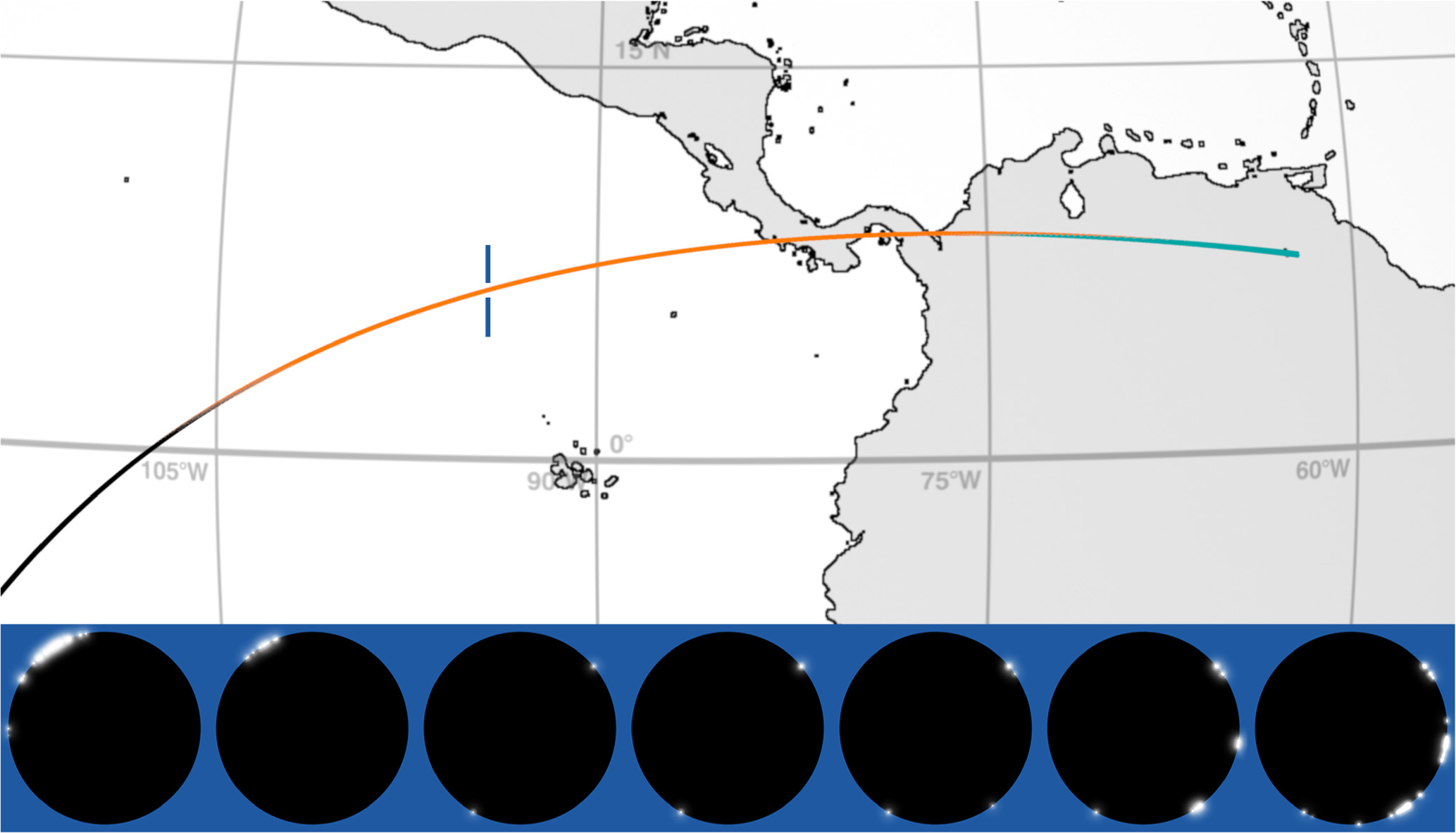 Figure 13. Top: the end of the very narrow shadow path for the 2005 April 8 hybrid eclipse. Moving from left to right, the shadow transitions from total (black) to broken annular (orange) and finally to annular (cyan). The broken annular part of the path is mapped using the criterion described in the text and assuming r☉ = 696,000 km. Bottom: simulation of Baily's beads at 1 s intervals from 21:55:26 to 21:55:32 UTC as viewed from 94.02587°W, 6.45677°N, the location marked on the map by a broken vertical line. Celestial north is up.