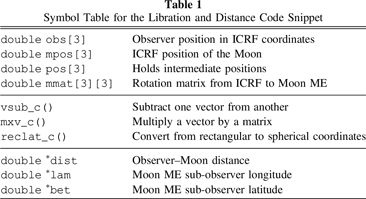 Table 1. Symbol Table for the Libration and Distance Code Snippet