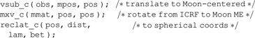 | mxv_c( mmat, pos, pos ); | /∗ rotate from ICRF to Moon ME ∗/ |