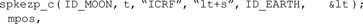 | spkezp_c( ID_MOON, t, "ICRF", "lt+s", ID_EARTH, mpos, | < ); |