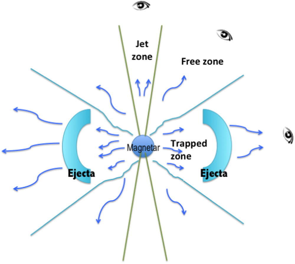 - 2.Free zone: the direction where no short GRB is observed, but X-rays can still escape freely. In Figure 1 this zone is marked as an annular ring around the jet, but in principle it can include the solid angle patches not covered by the ejecta in any direction. Since a millisecond magnetar wind is supposed to be essentially isotropic, throughout the paper we assume that the X-ray luminosities in the free zone and in the jet zone are the same;
