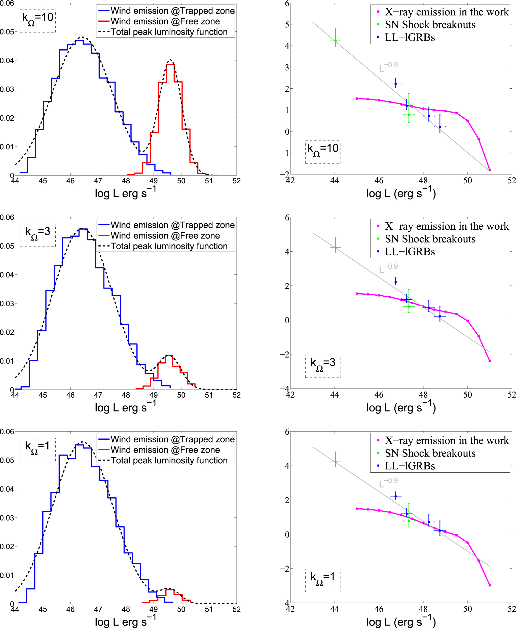 Standard image High-resolution imageThe prediction for EP is very promising. With the high sensitivity and large field of view, EP may be able to detect ∼100 such events per year. Considering that for some parameters the light curves in the trapped zone show rapid decline as a function of time, which effectively reduce the integration time (with respect to the constant luminosity case), we more conservatively suggest a detection rate of several tens per solid angle per year for EP. The detections by EP would validate the existence of such events, testify the LFs of the transients, and constrain the range of kΩ.