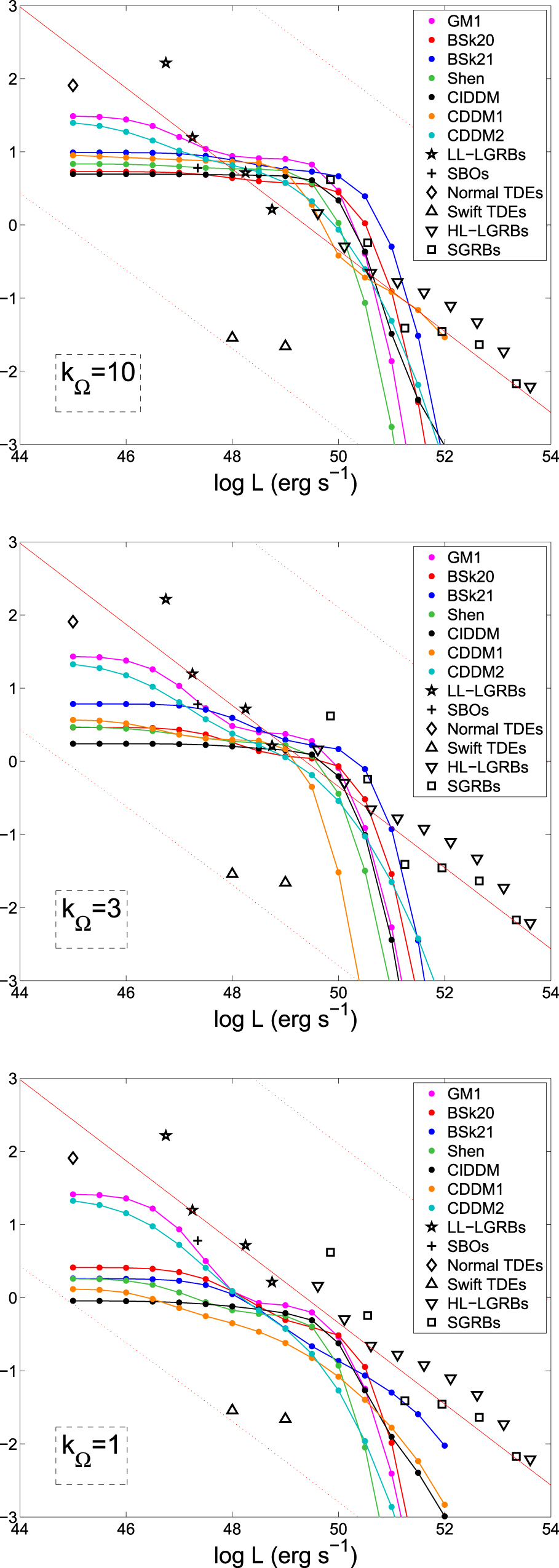 The LF and event rate density of the X-ray transients depend on many factors, including the EoS, solid angle fraction kΩ, and many other unknown parameters associated with the ejecta and the magnetar. Lacking observational data, it is impossible to give a unique prediction. In the following, we take GM1 EoS as an example (Lasky et al. 2014; Gao et al. 2016a), and discuss other EoSs through a comparison of the results. For each EoS, we adopt some typical parameters inferred from the sGRB data, and make predictions by assuming different values of kΩ.