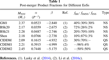 For GM1, it was found that fBH : fSMNS : fSNS = 40%:30%:30% for prompt black holes, supra-massive NSs, and stable NSs (Gao et al. 2016a). The latter two are relevant to the X-ray transients we model.