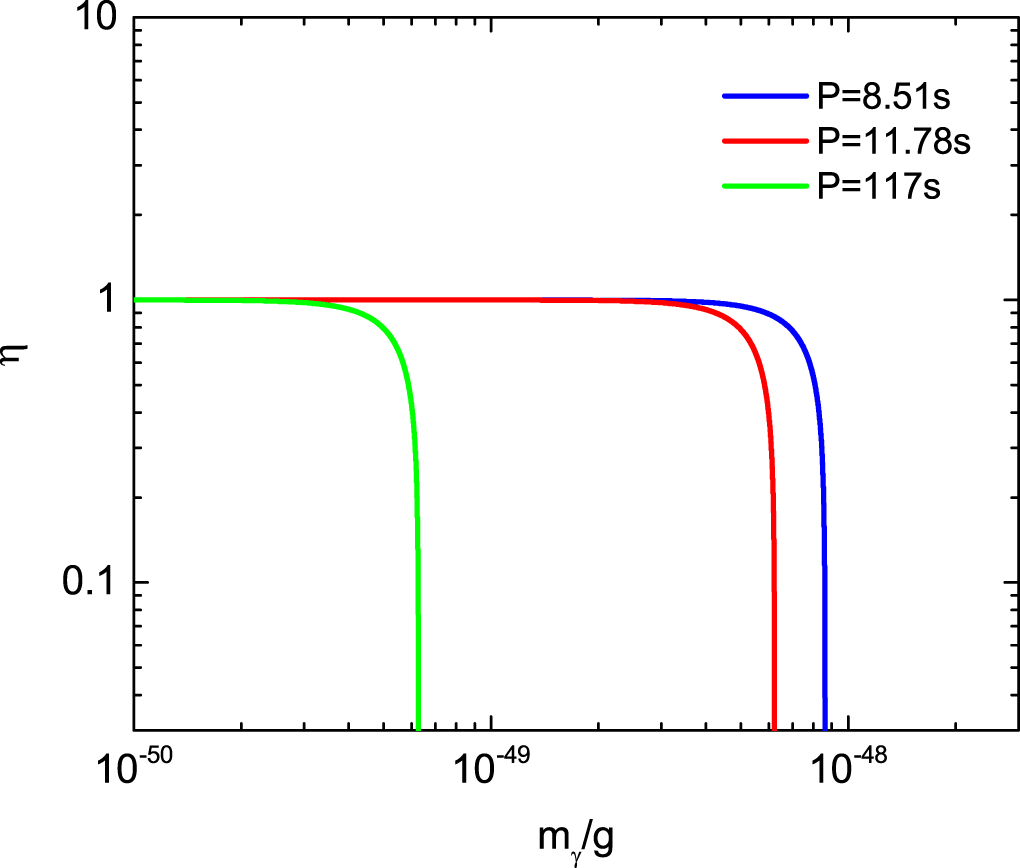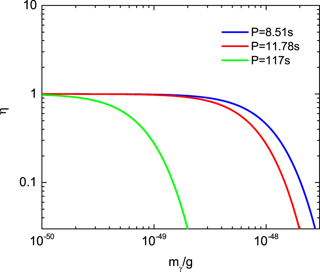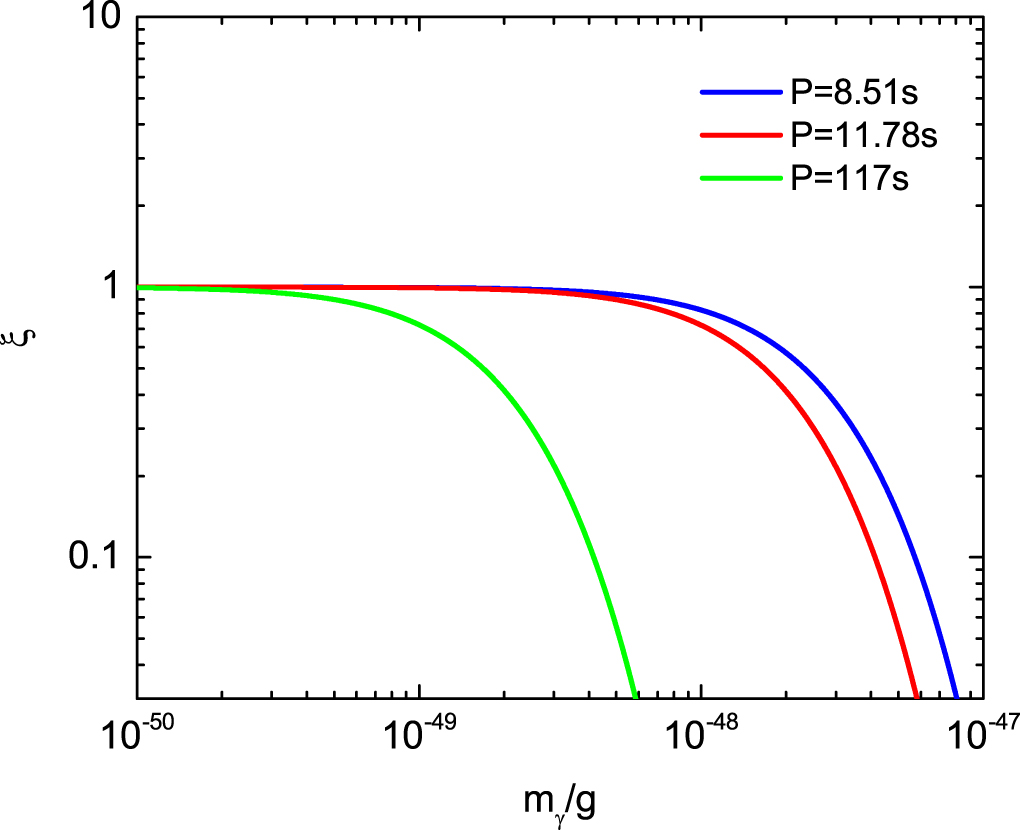 In Figure 1, the blue, red, and green lines denote the periods of PSR J2144−3933, 1ES 1841−045 and the WD pulsar in AR Scorpii, respectively. The respective constrained upper limits of the photon mass are shown in Table 1: for PSR J2144−3933, one has