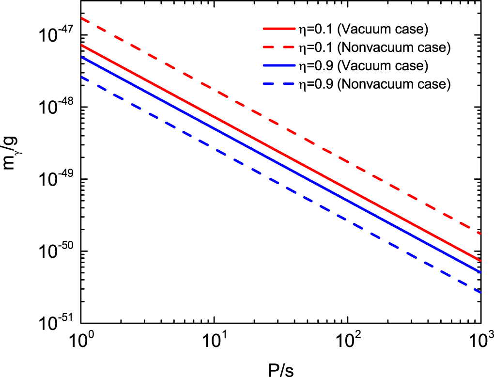 Figure 5. Constraints on mγ for different P. The solid and dashed lines denote the vacuum dipole spin-down case and the nonvacuum wind spin-down case, respectively. We adopt
