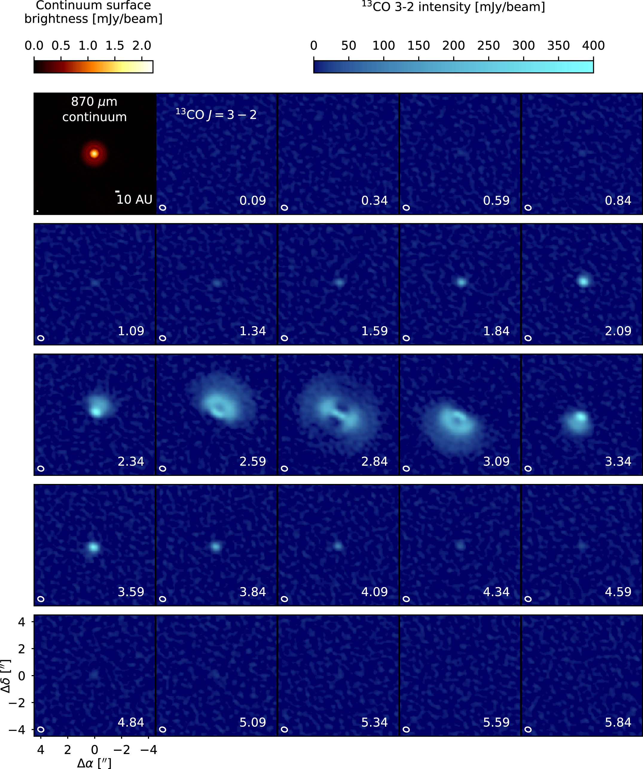 Figure 11. Channel maps of the 13CO J = 3 − 2 transition in the TW Hya disk, along with the 870 μm continuum emission in the upper leftmost panel shown on the same spatial scale. Synthesized beams are drawn in the lower left corner of each panel. The LSR velocity (km s−1) for each 13CO channel is shown in the lower right corner, matching the velocities shown for 12CO in Figure 2.