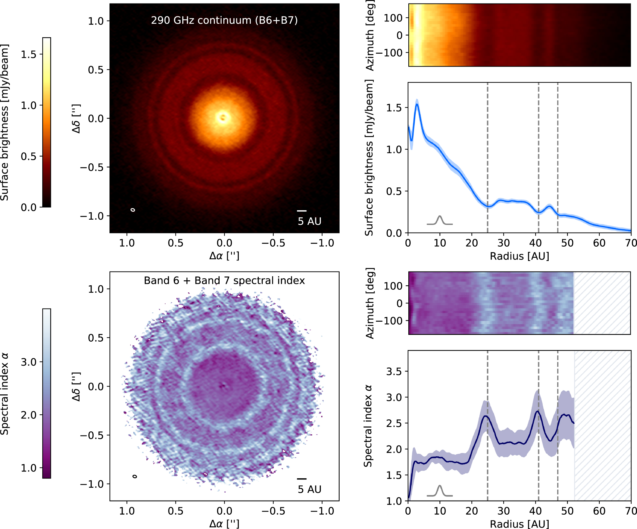 Figure 1 shows that the azimuthally averaged spectral index values range from roughly 2.1 to 2.3 inside the bright emission rings at 35 and 45 au. These α values are possible if τ ⪅ 1.5 (see Figure 9), still allowing the rings to be marginally optically thick. Even higher local values of τ may be compatible with the low brightness temperatures if the bright emission rings at 35 and 45 au are actually a series of unresolved rings that result in a low beam filling factor (e.g., Ricci et al. 2012). Andrews et al. (2016) tentatively identified additional emission gaps between 30 and 35 au, noting that higher angular resolution and sensitivity would be needed to confirm.