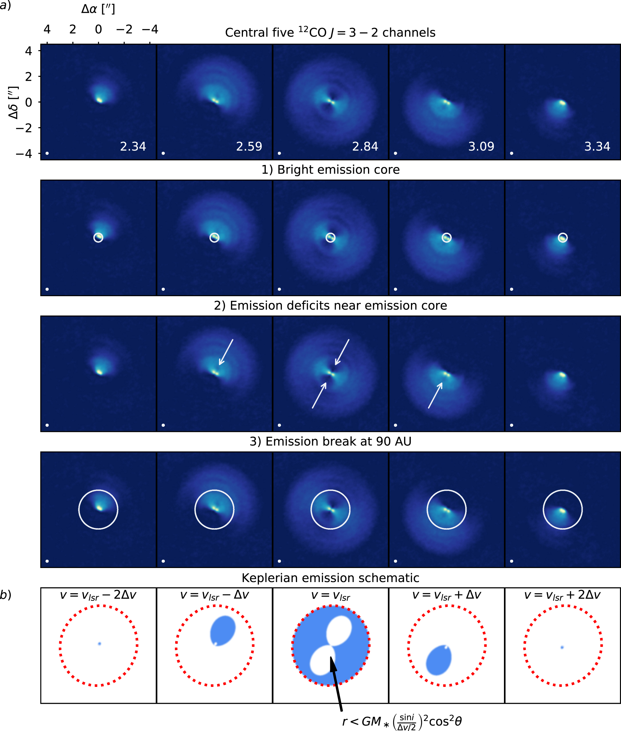 Standard image High-resolution imageFigure 3. (a) Annotated maps of the central five channels of 12CO J = 3 − 2 to highlight the key emission features (see Figure 2 for context). (b) Schematic of the line emission morphology of a Keplerian disk (neglecting thermal and turbulent line broadening and beam smearing). The velocity is listed at the top of each panel. The dotted red ellipse marks the boundary of the projected disk. In the central panel at the systemic velocity, the region of the disk that contributes no emission is marked.